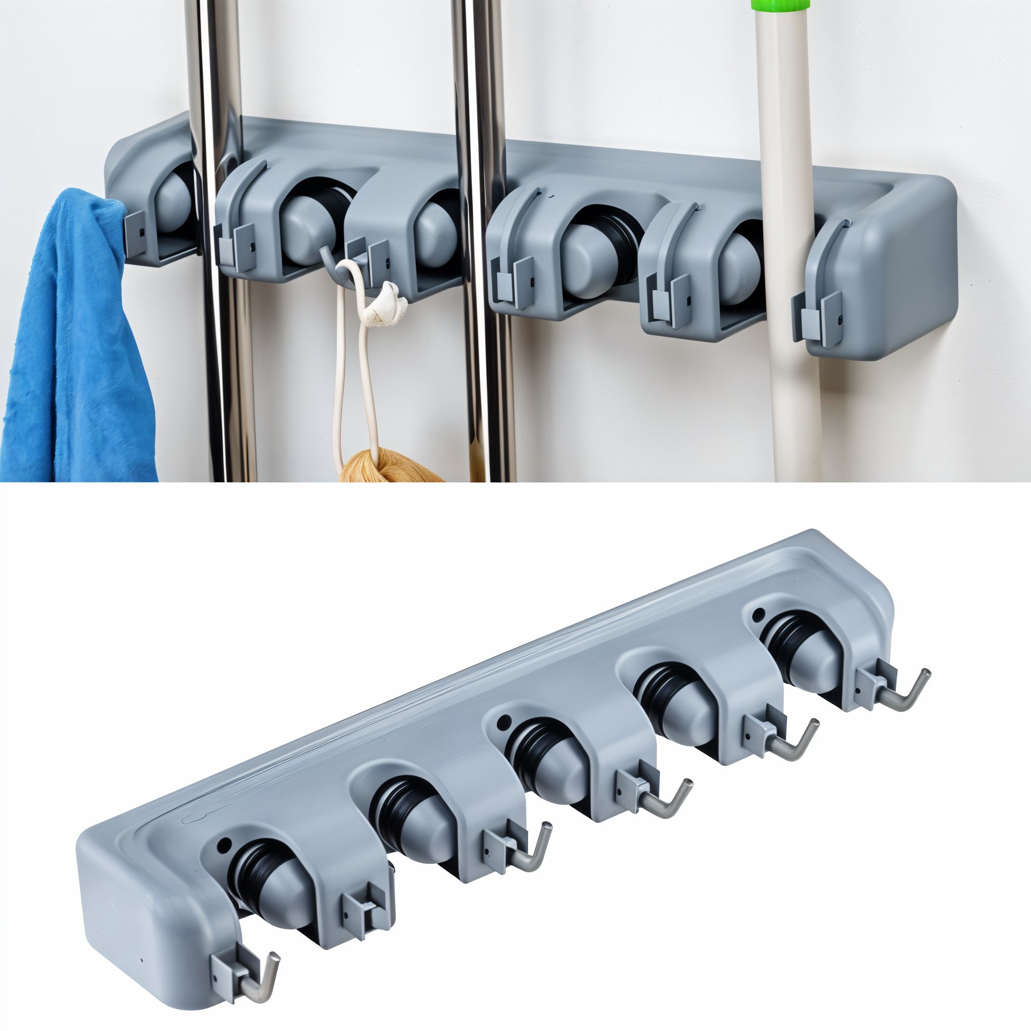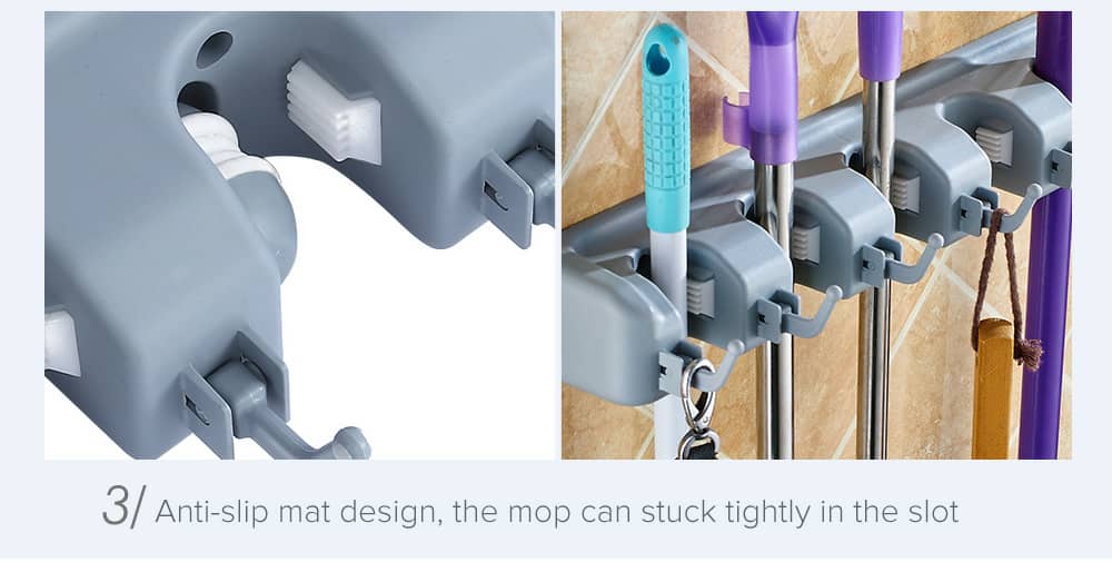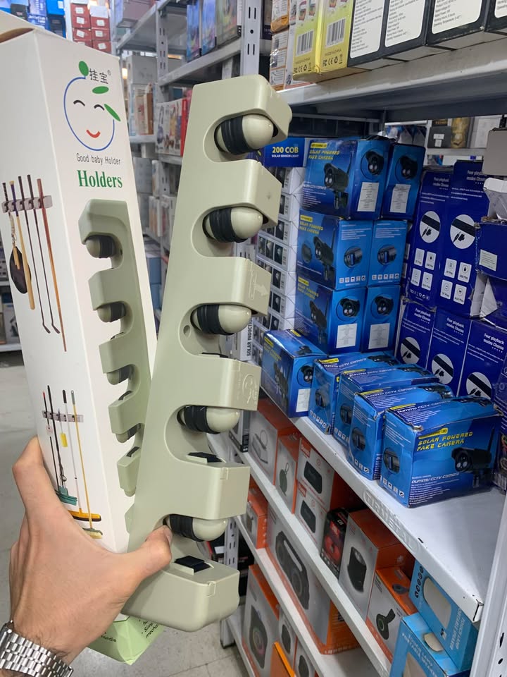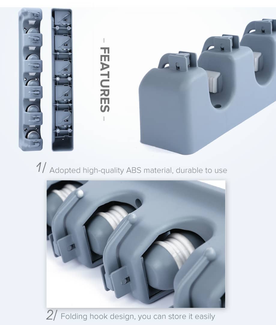 حامل المكانس يريحك من فوضى المكانس وأدوات التنضيف، يمسك العصى بقبضتين وتكون كل المكانس باتجاه واحد للأسفل بمنظر جد مرتب ومريح لا تشغل حيز ومساحة كبيرة على العكس توفر أكبر مساحة ممكنة..يمكن تثبيتها على الحائط أو على باب الخزانه.تحتوي على خمس فتحات تستوعب عدد كبير من الأغراض: كما يوجد بها 6 علاقات لمختلف الأدوات .. قدم طلبك فورا …